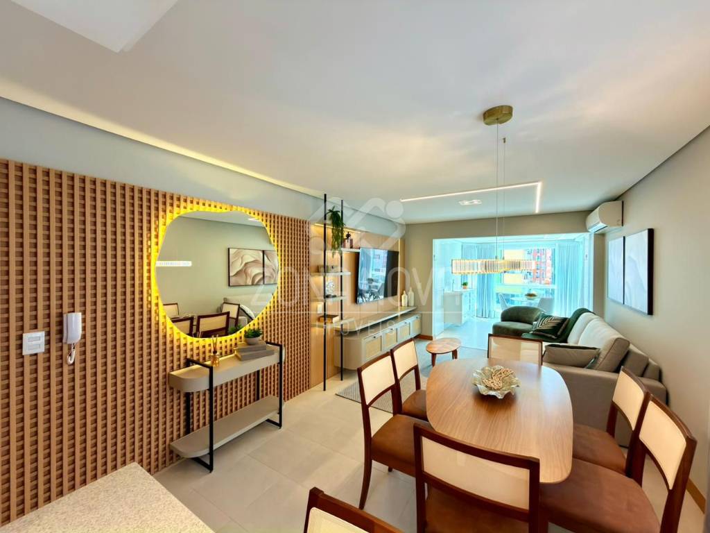 104 m² de área privativa, 03 dormitórios/01 suíte, posição solar leste, todos os ambientes com vista liberada, mobiliado e decorado,água quente e gás central, ar split em todos os ambientes, sacada com espaço gourmet, sala de estar, sala de jantar, cozinha equipada, área de serviço separada, banheiro social, rebaixo em gesso e 02 vagas de garagem (cabe camionete). Edifício de alto padrão construtivo, hall de entrada com 02 elevadores, zeladoria permanente, junto à praças e próximo a todos comércios locais!