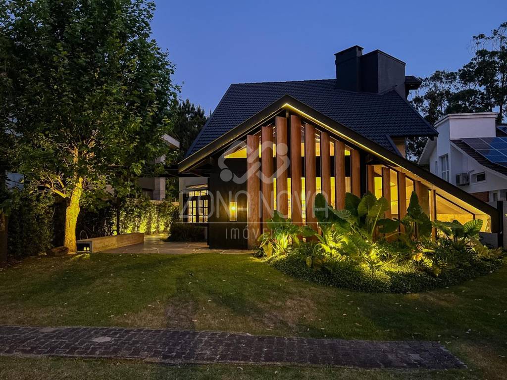 Sobrado moderno a venda no Lagos Park, em Atlântida! Imóvel mobiliado e decorado/pronto para uso, 294M² a casa e 450M² o lote, 04 suítes (02 térreas), living com os ambientes integrados, lavabo, lareira a lenha, pé direito alto, sala de jantar, cozinha americana com gourmet, lavanderia, sala de TV/jogos na parte superior com mesa de bilhar + terraço, área externa com varanda, piscina de concreto, paisagismo completo, abrigo para carros e fachada com detalhes únicos.