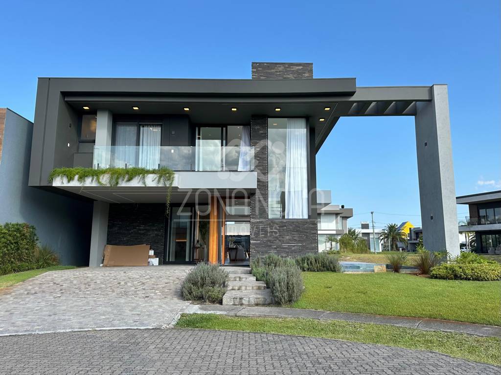 Imóvel novo e nunca habitado, totalmente mobiliado/pronto para usufruir, conta com cinco suítes (uma térrea, uma principal), Living amplo e com os ambientes integrados, pé-direito duplo, lareira ecológica, muita entrada de iluminação e ventilação natural , sala de jantar, lavabo, cozinha americana com gourmet, lavanderia com acesso à parte externa da casa, aquecedor de água a gás instalado, todos ambientes climatizados, área externa a beira do lago, piscina de concreto, paisagismo, abrigo para carros e fachada imponente.