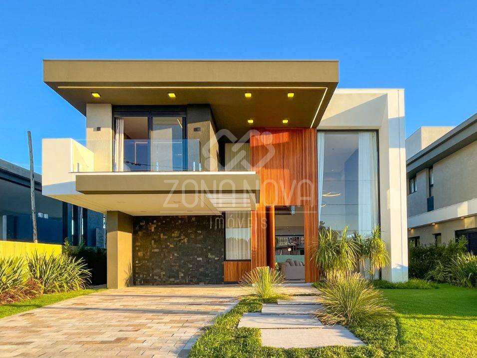 Sobrado de alto padrão, 413 m² de área construída, mobiliado e decorado, 05 suítes/01 suíte térrea, living com pé direito alto, sala de estar com lareira ecológica, sala de jantar, cozinha com bancada + espaço gourmet integrado com churrasqueira, todos os ambientes climatizados, lavanderia separada, gás central, aquecedor de água a gás já instalado, lavabo, área de lazer espaçosa, piscina de concreto, área verde nos fundos, living integrado a área de lazer, projeto de fachada moderno com detalhes em LED, madeira, paisagismo e vaga para carros. Condomínio com infraestrutura completa, acesso a lagos dos Quadros e portaria/segurança 24 horas. Entre em contato para mais informação.