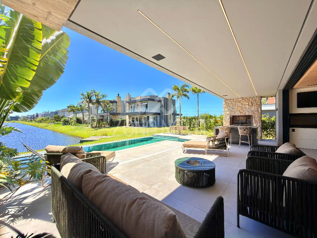 Casa nova e de alto padrão construtivo, vista sensacional para o lago e com 345 M² privativos, mobiliada e decorada, 04 suítes (01 master, 01 térrea), lavabo, living amplo e com ambientes integrados, sala de TV com pé direito duplo e lareira a lenha, sala de jantar, espaço com mesa de bilhar, cozinha americana com gourmet, 100% climatizada, área de serviços separada, aspiração central, sistema de automação, placa solar Weg, home office, rouparia com tulha, área externa com varanda, piscina de concreto, outro espaço gourmet equipado, paisagismo, garagem para jetski, abrigo para carros e fachada imponente.