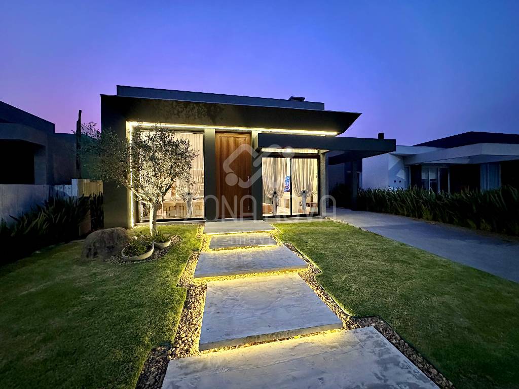 Casa pronta para usufruir com 198M², alto padrão em todos detalhes com 04 suítes (02 com hidro), lavabo, living com pé direito alto, ambientes integrados, lareira a lenha, cozinha americana com gourmet, área de serviço separada, todos ambientes climatizados, água quente instalada, área externa com jacuzzi, abrigo para carro, paisagismo e está bem localizada no condomínio.