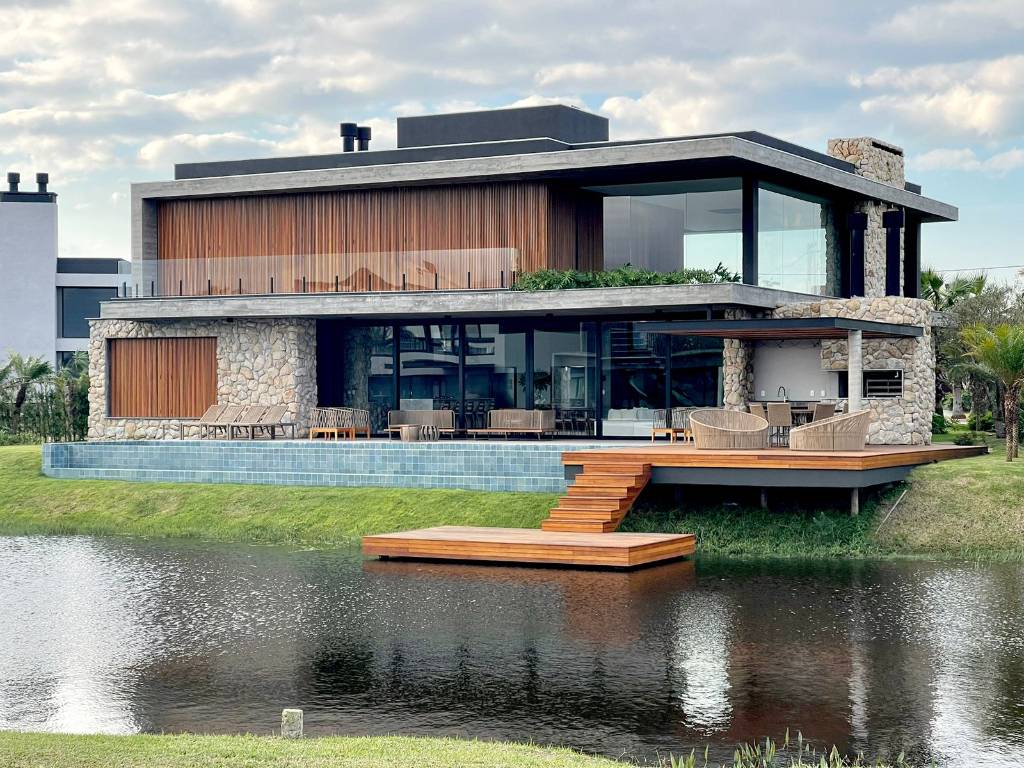 Sobrado com 516 M² de área construída, e 750 M² o lote, mobiliado/pronto para uso, 05 suítes (01 master e 01 térrea), lavabo, dependência de serviços com banheiro, living com pé direito duplo, lareira, elevador, cozinha americana com espaço gourmet, área de lazer externa a beira do lago com piscina de concreto, paisagismo, outro espaço gourmet e lavabo, piso aquecido e ar Split em todos ambientes, energia fotovoltaica, lavanderia, abrigo coberto para carros e fachada contemporânea com detalhes em pedras e madeira. Entre em contato!