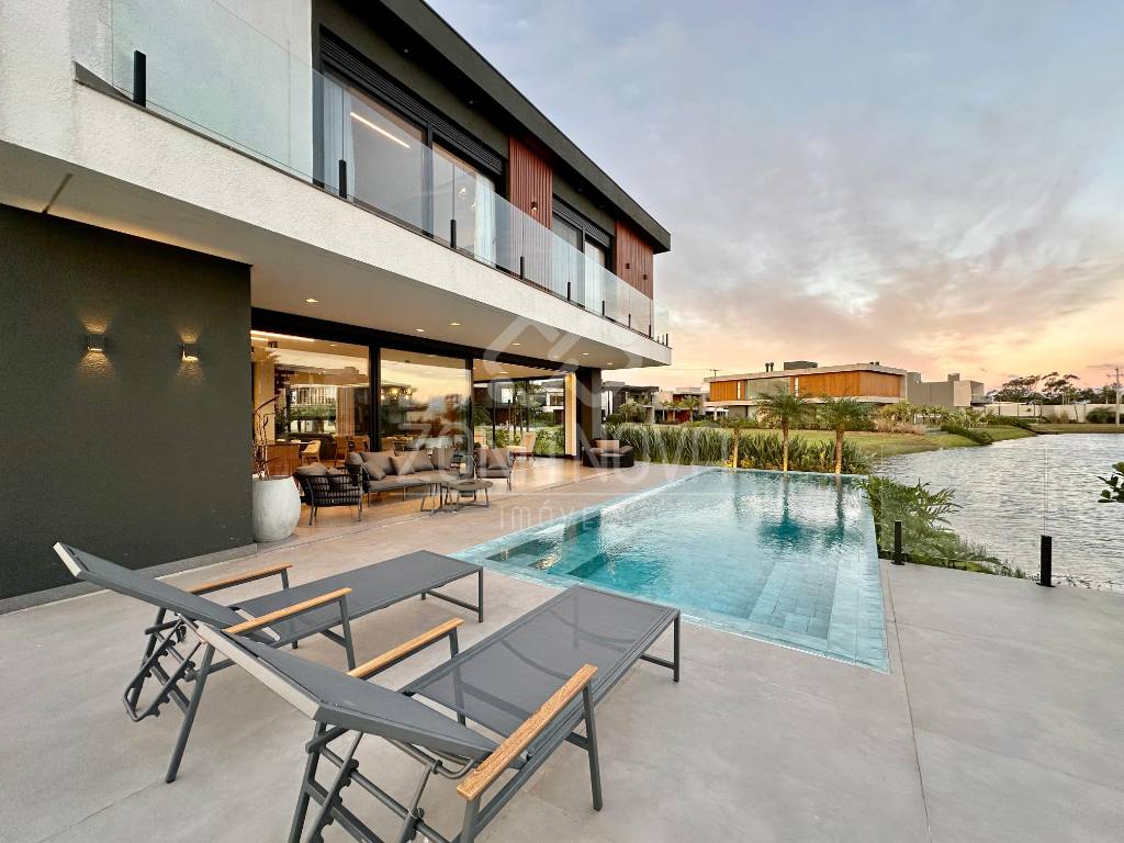 Sobrado beira lago, no condomínio Sense! Imóvel contemporâneo, com 437 M² de área construída, em um lote de 457 M², nova/nunca habitada, conta com 05 suítes (01 master), dependência completa, está mobiliado e decorado/pronto para uso, living espaçoso com ambientes 100% integrados, lareira ecológica, lavabo, elevador, cozinha americana com espaço gourmet, cozinha auxiliar, lavanderia, sala de Tv/cinema com banheiro, ambientes climatizados, área externa a beira do lago com piscina de concreto, paisagismo, trapiche, abrigo para carros e fachada contemporânea.