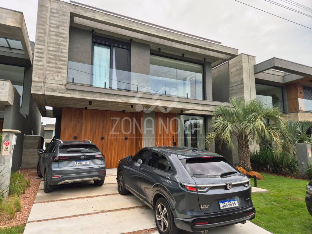 Casa nova mobiliada e decorada, 300 M² com 04 suítes (01 térrea), lavabo, living com ambientes integrados, pé direito, lareira a lenha, cozinha americana com churrasqueira, área de serviço separada, ambientes climatizados, área externa a beira do lago com piscina, paisagismo, abrigo para carros e fachada imponente.