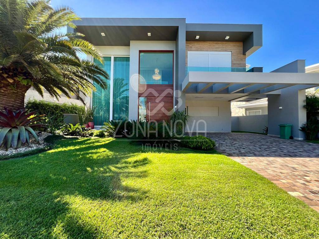 Mansão à beira do lago principal no condomínio Enseada Lagos, em Xangri-lá. Este sobrado de 473 m² possui 05 suítes (sendo 01 térrea), dependência de serviços com banheiro, lavabo, está mobiliado e decorado, conta com um living amplo, lareira, ambientes integrados, cozinha americana, espaço gourmet equipado, lavanderia, piso em mármore, área externa com piscina de concreto, paisagismo e abrigo coberto para carros.