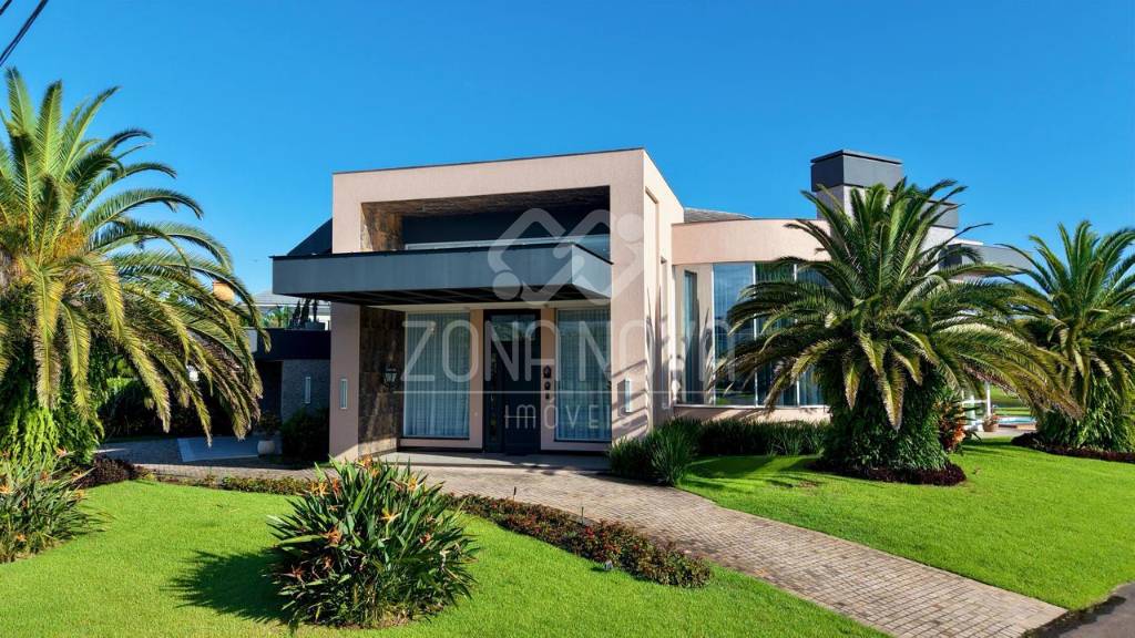 Sobrado com 621 M² privativos, mobiliado/pronto para usufruir, 05 suítes (01 térrea, 01 master), lavabo, dependência com banheiro, living amplo com ambientes integrados, pé direto duplo, elevador, sala de TV com lareira, sala de jantar, mesa de bilhar, cozinha americana com gourmet, lavanderia, ambientes climatizados, alto padrão construtivo, área de lazer externa a beira do lago com piscina de concreto, paisagismo completo, abrigo para carros e fachada minimalista. Entre em contato!