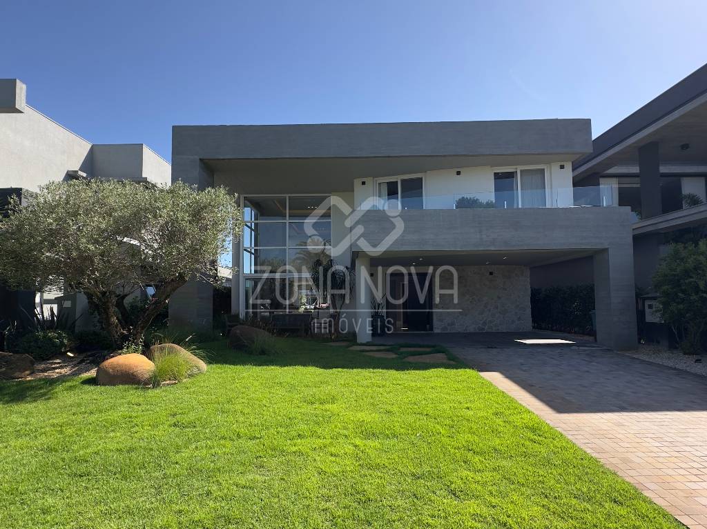 Sobrado de alto padrão construtivo e bem localizado no condomínio, mobiliado e decorado/pronto para uso, conta com cinco suítes (uma térrea), lavabo, Living espaçoso com pé direito duplo, lareira a lenha, sala de jantar, cozinha americana com churrasqueira, área de serviço separada com acesso à área externa e com banheiro auxiliar, todos ambientes climatizados, esquadrias em PVC, área de lazer à beira do lago com uma vista sensacional, piscina de concreto aquecida, paisagismo completo, abrigo para carros e fachada contemporânea.